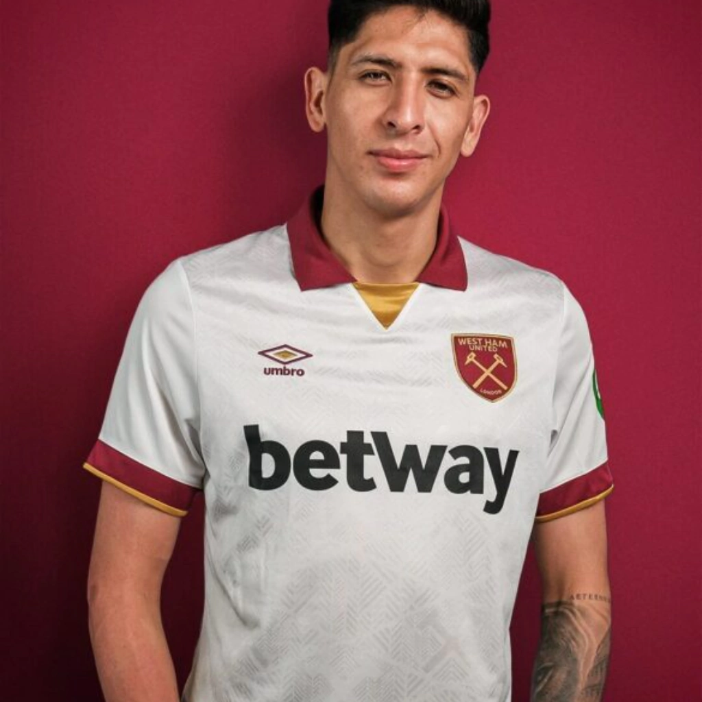 A nova terceira camisa do West Ham Umbro 2024-2025 é a representação perfeita do orgulho e da paixão dos torcedores. Com um design moderno e elegante, a camisa branca apresenta um jacquard frontal que combina os icônicos diamantes da Umbro com os martelos cruzados, símbolo do clube. A gola polo bordô, com detalhe dourado, e os punhos com bordas douradas completam o visual sofisticado. O escudo do West Ham, em destaque no lado esquerdo do peito, e o logo especial do centenário da Umbro, no lado direito, são um tributo à história e tradição do clube. Nas costas, os martelos cruzados em bordô e o nome e número dos jogadores em preto finalizam o design autêntico. Adquira já a sua camisa e mostre sua paixão pelos Hammers!"