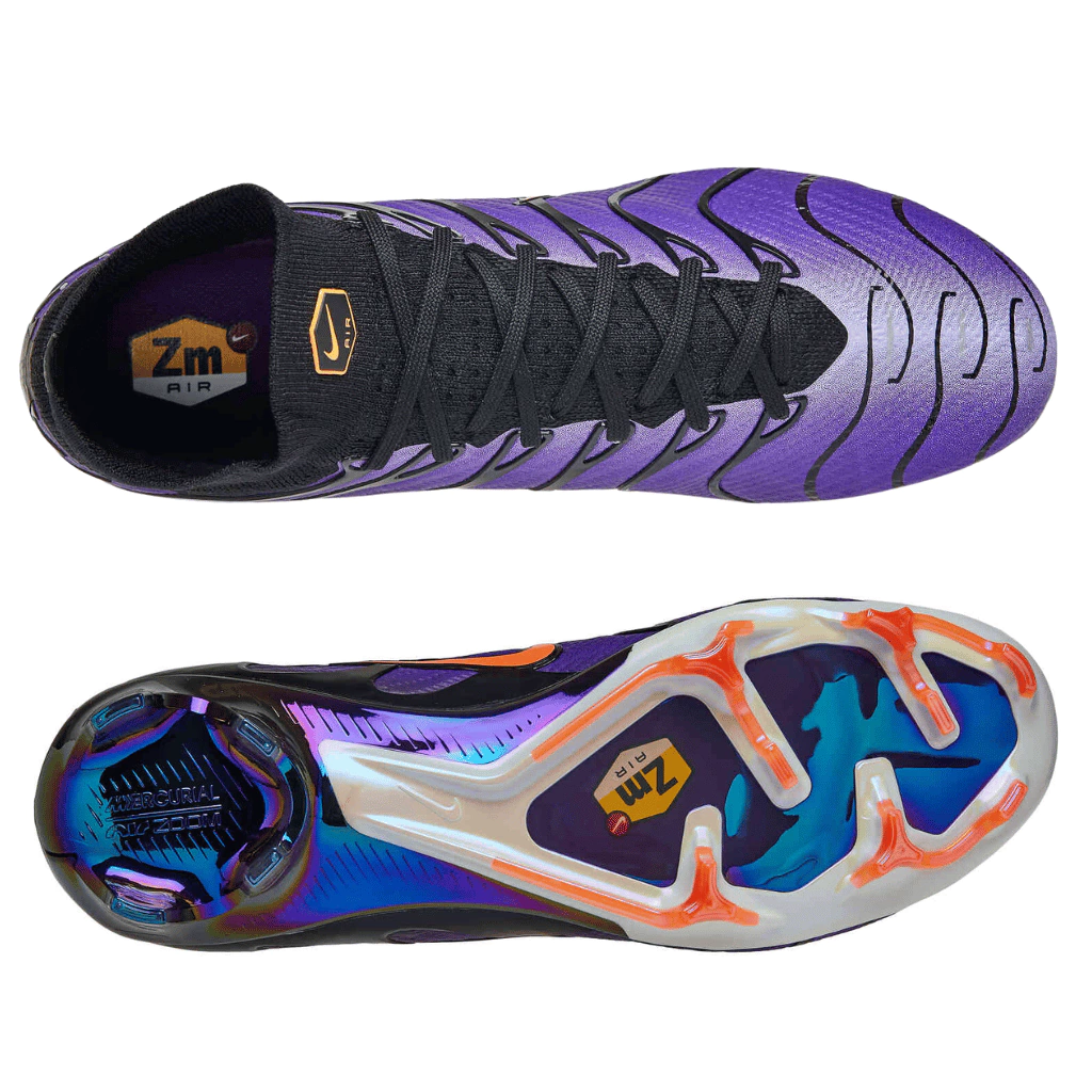 Destaque-se no campo com as incríveis chuteiras Nike Air Zoom Mercurial Superfly 9 x Air Max Plus FG em edição especial roxa, preta e laranja. Inspiradas no icônico Nike Air Max Plus, estas chuteiras são mais do que calçados esportivos, são uma expressão de estilo e comunidade. Adquira agora e faça parte dessa revolução de subcultura!